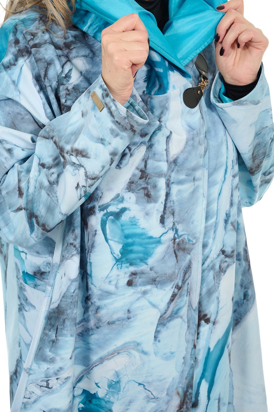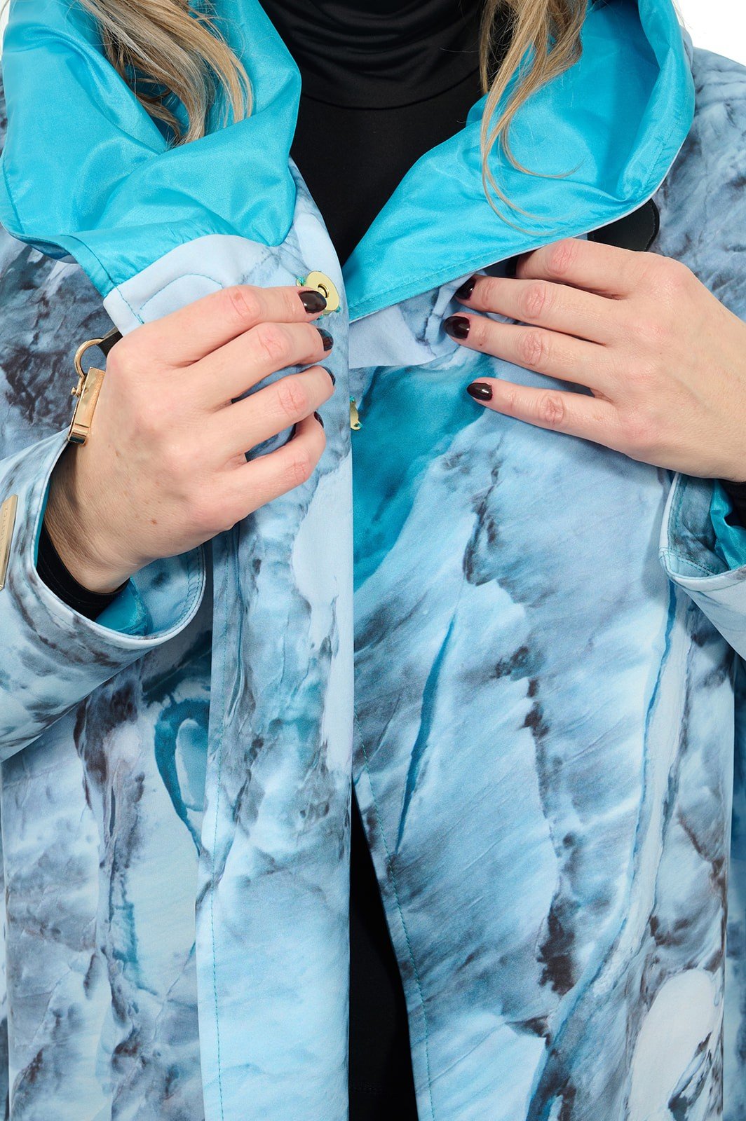 Discover the perfect harmony of elegance and functionality in our unique hooded coat, crafted from premium waterproof material. In stunning blue shades straight from Alaska’s glaciers, this one of a kind product combines minimalist design with excellent rain protection.