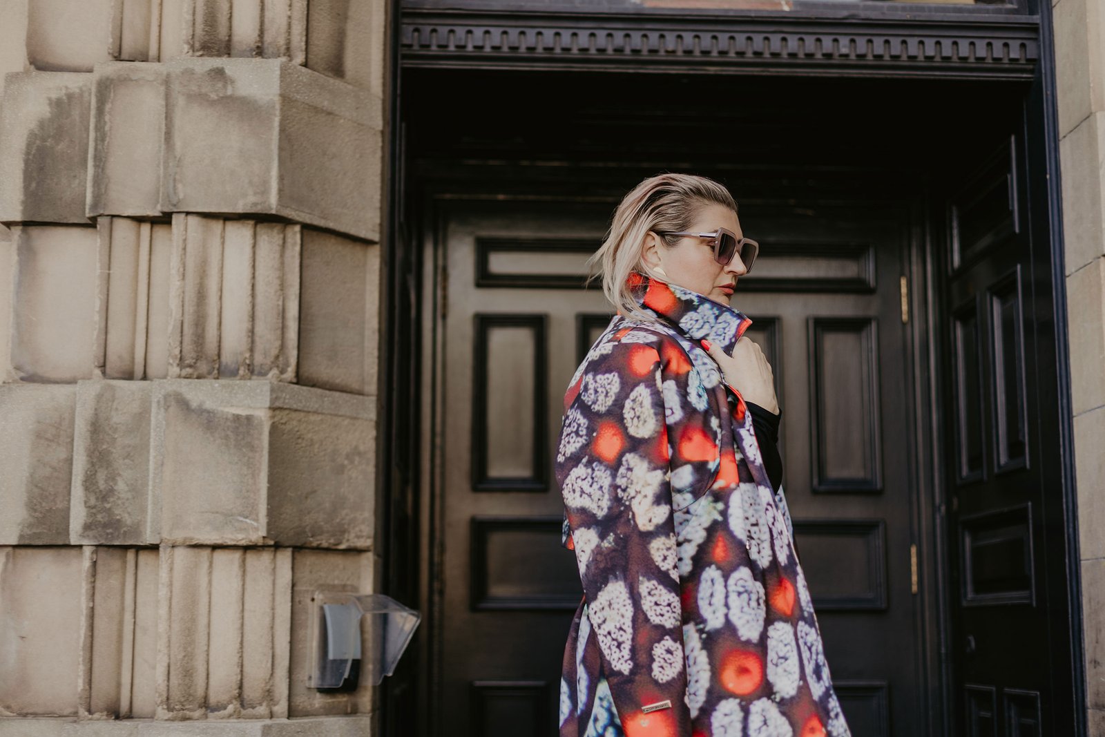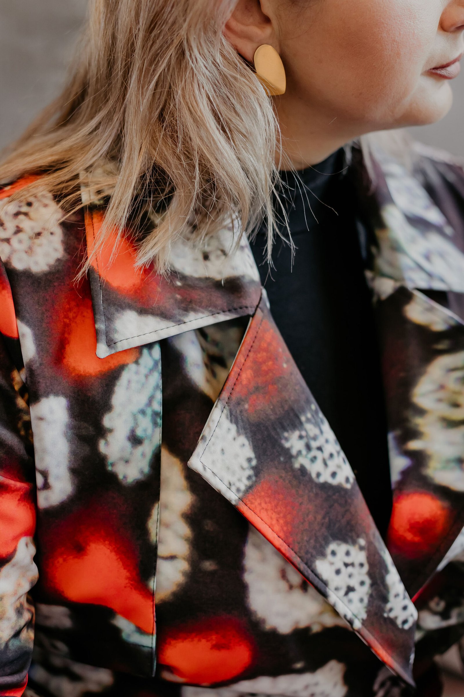 The design reflects the beauty and intricate details of marine life, captured in a close-up image that reveals the unique shapes and textures of a starfish.Let the colours of the ocean and tropical depths infuse your outfit with warmth, character, and a hint of natural magic. This short belted coat is the perfect choice for women who love elegant fashion, modern comfort, and color palettes inspired by nature’s most remarkable scenes.