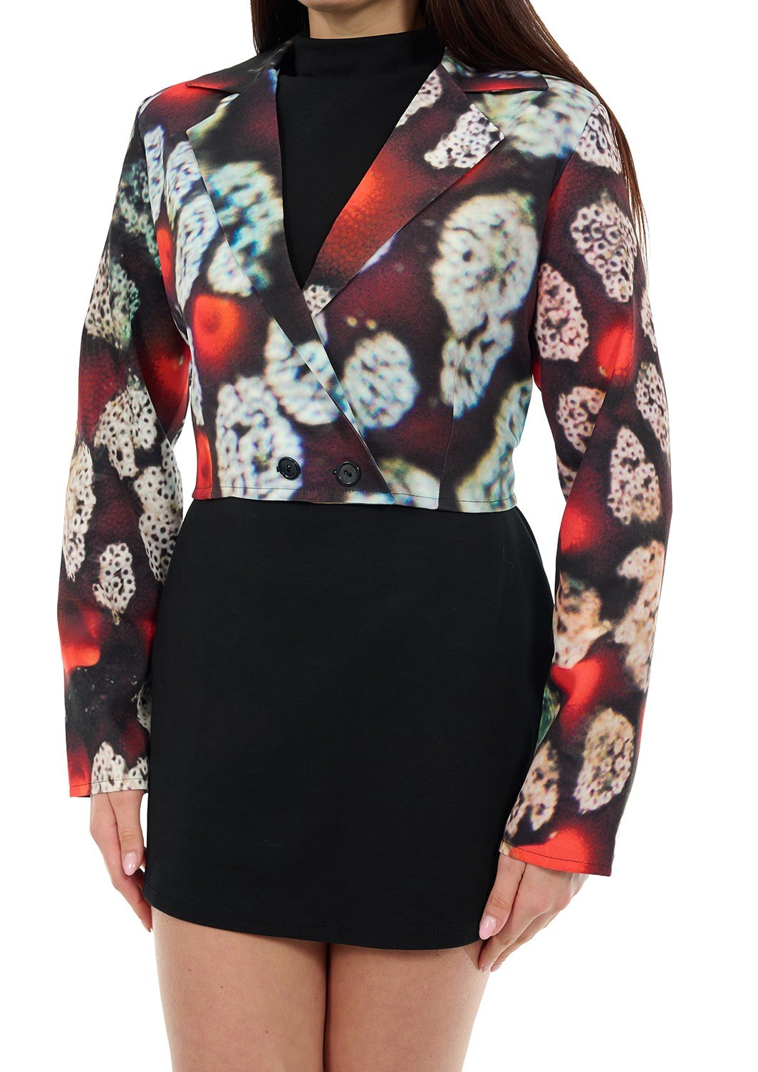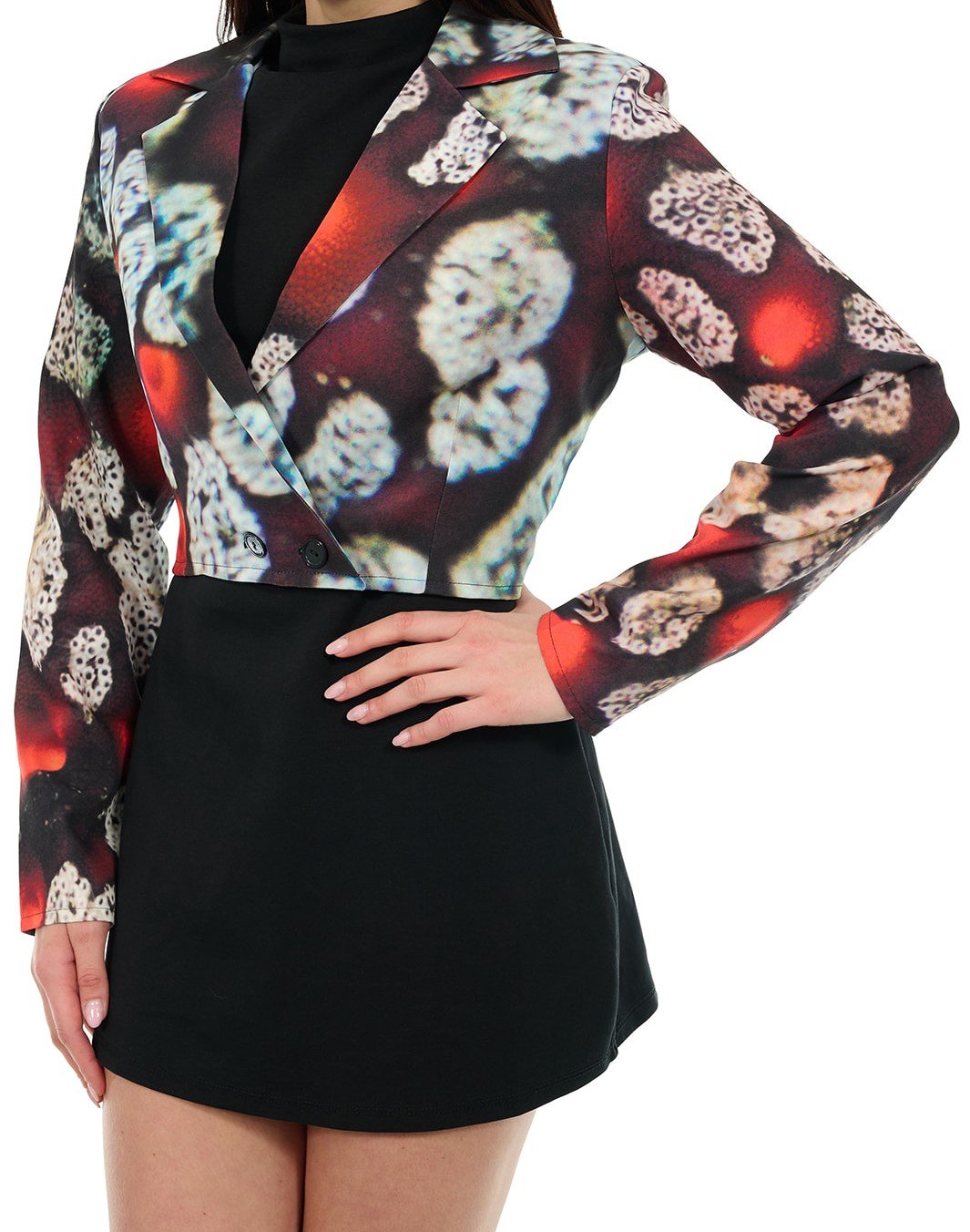 The Red Underwater World of Ecuador cropped women’s blazer blends passion, nature, and modern sophistication. Its deep red tone, inspired by Ecuador’s underwater landscapes, radiates confidence and refined charm, adding a luxurious accent to any outfit.