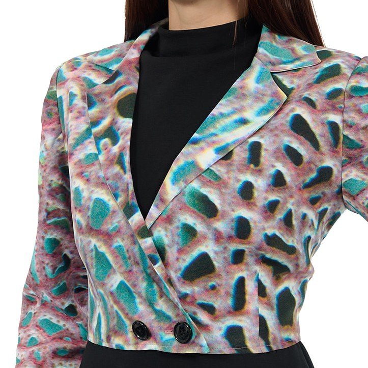 Discover the perfect harmony of style and comfort in this elegant short women’s blazer inspired by the underwater world. It captivates with beautiful natural shades and a refined feminine cut ideal for business meetings, dinner dates, or city strolls. The unique print featuring deep turquoise coral from Colombia, captured during a dive, showcases nature’s wonders in their most stunning form. Crafted from soft, pleasant to touch fabric, it ensures all day comfort. The elegant tailoring beautifully accentuates your silhouette, while the versatile fit pairs perfectly with classic and modern outfits.