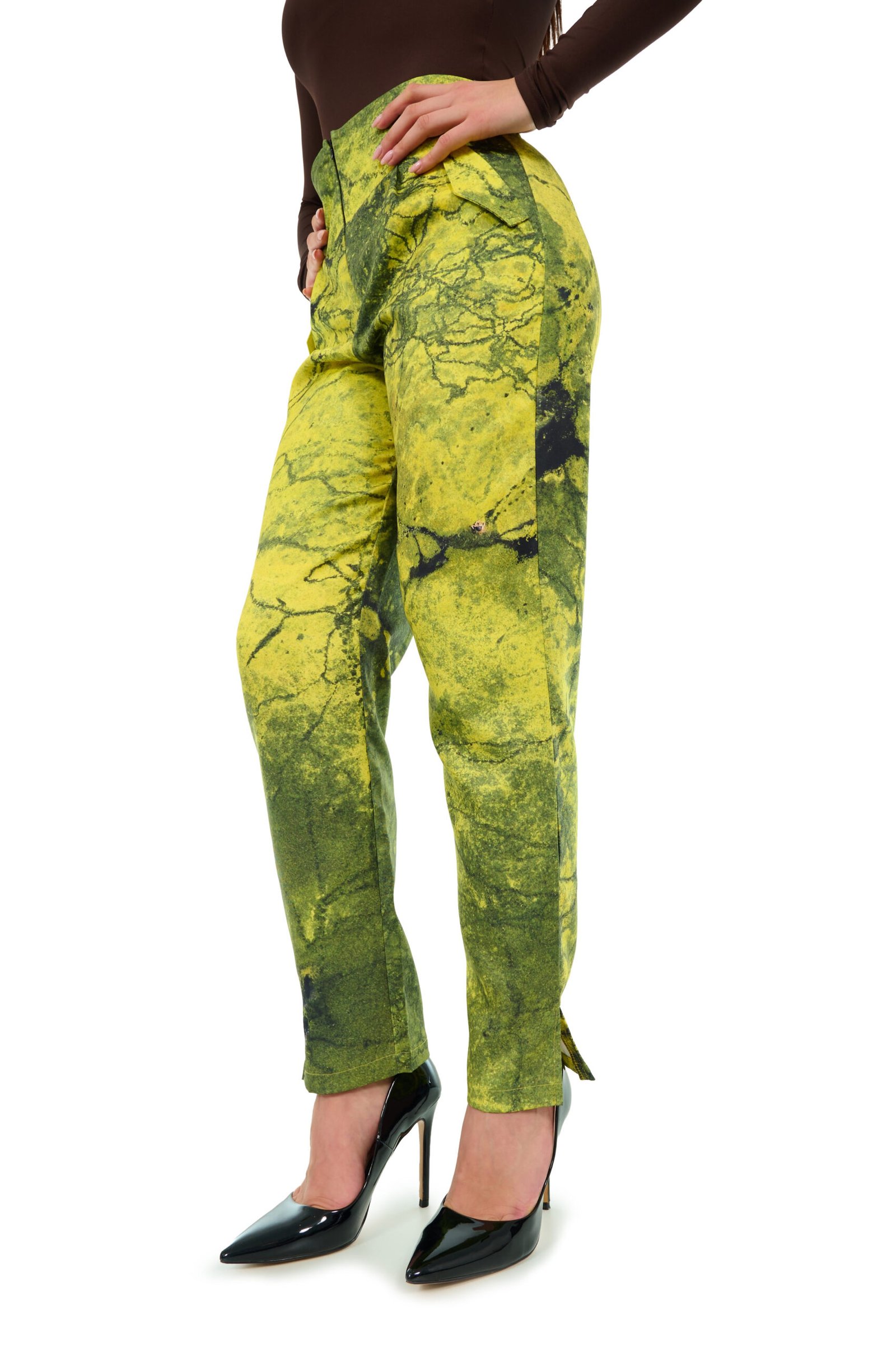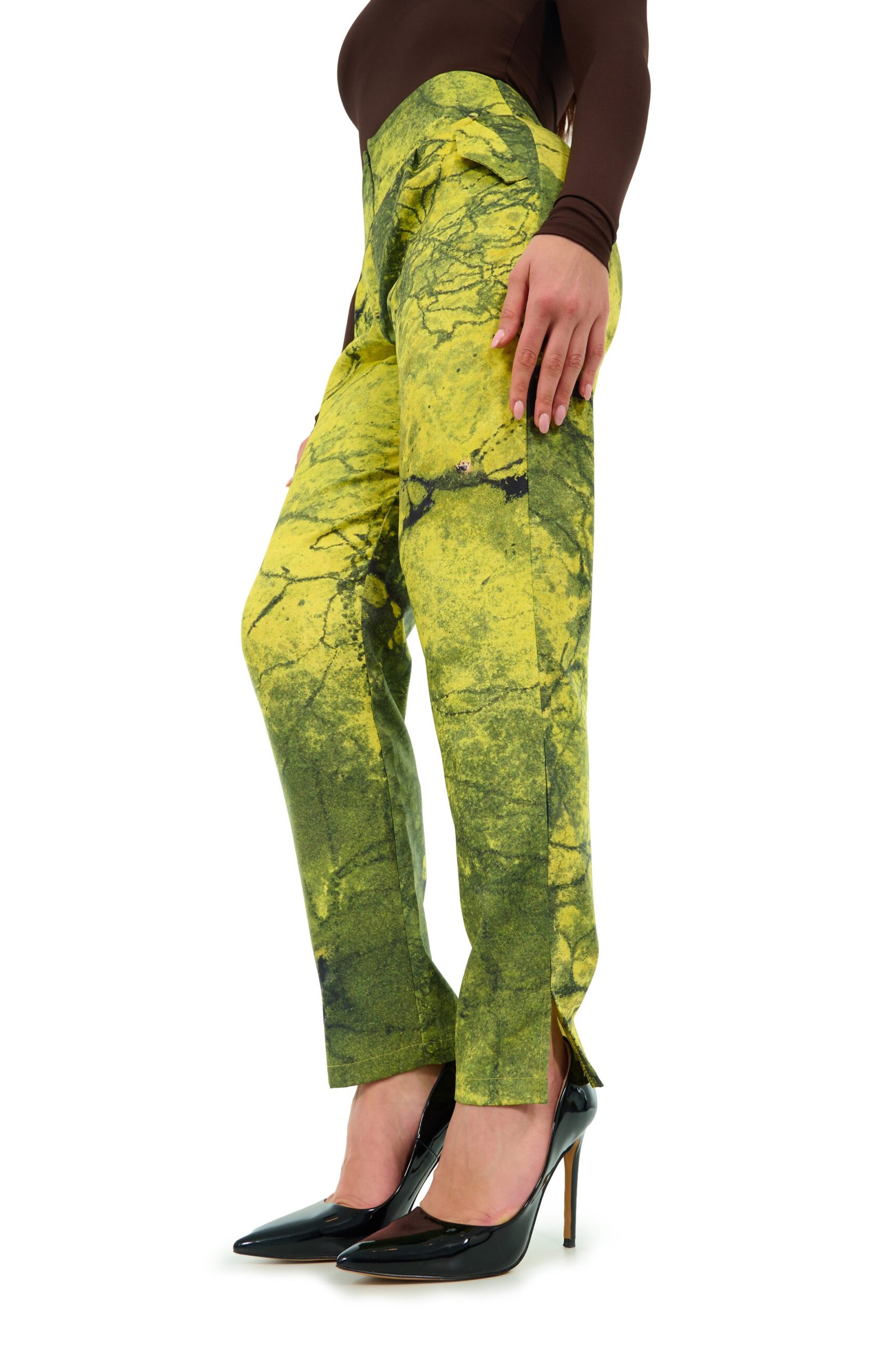 High waisted trousers with a unique print in the colors of waterborne algae. Deep green intertwines with energetic yellow, catching the eye and bringing a fresh touch to any outfit. The straight, slightly tapered leg visually elongates the figure, while subtle slits at the ankles add a modern twist. The front fastening makes them comfortable to wear and perfect both with elegant high heels and with comfortable everyday shoes. This design is made for those who love bold, artistic prints and enjoy standing out from the crowd.