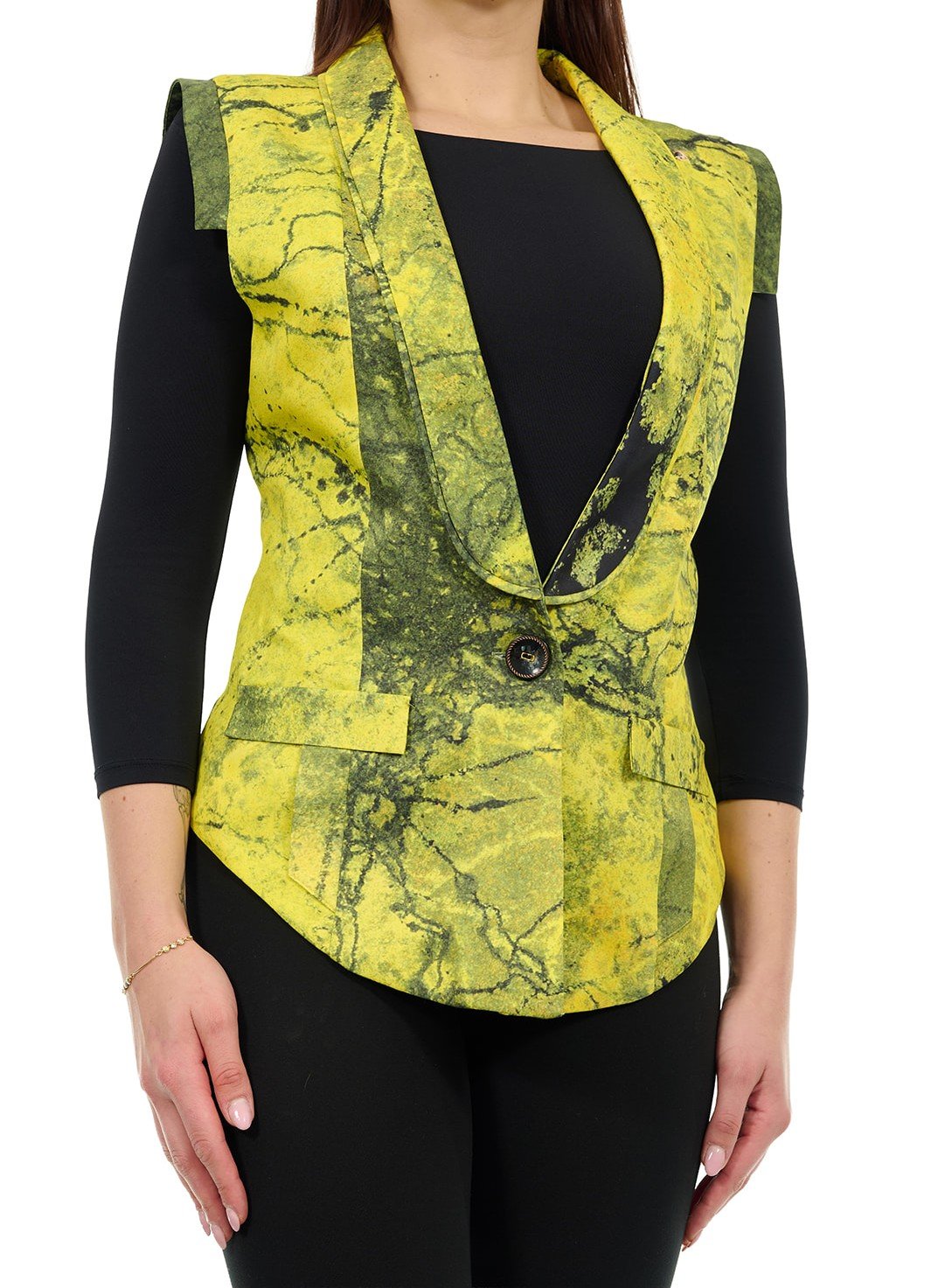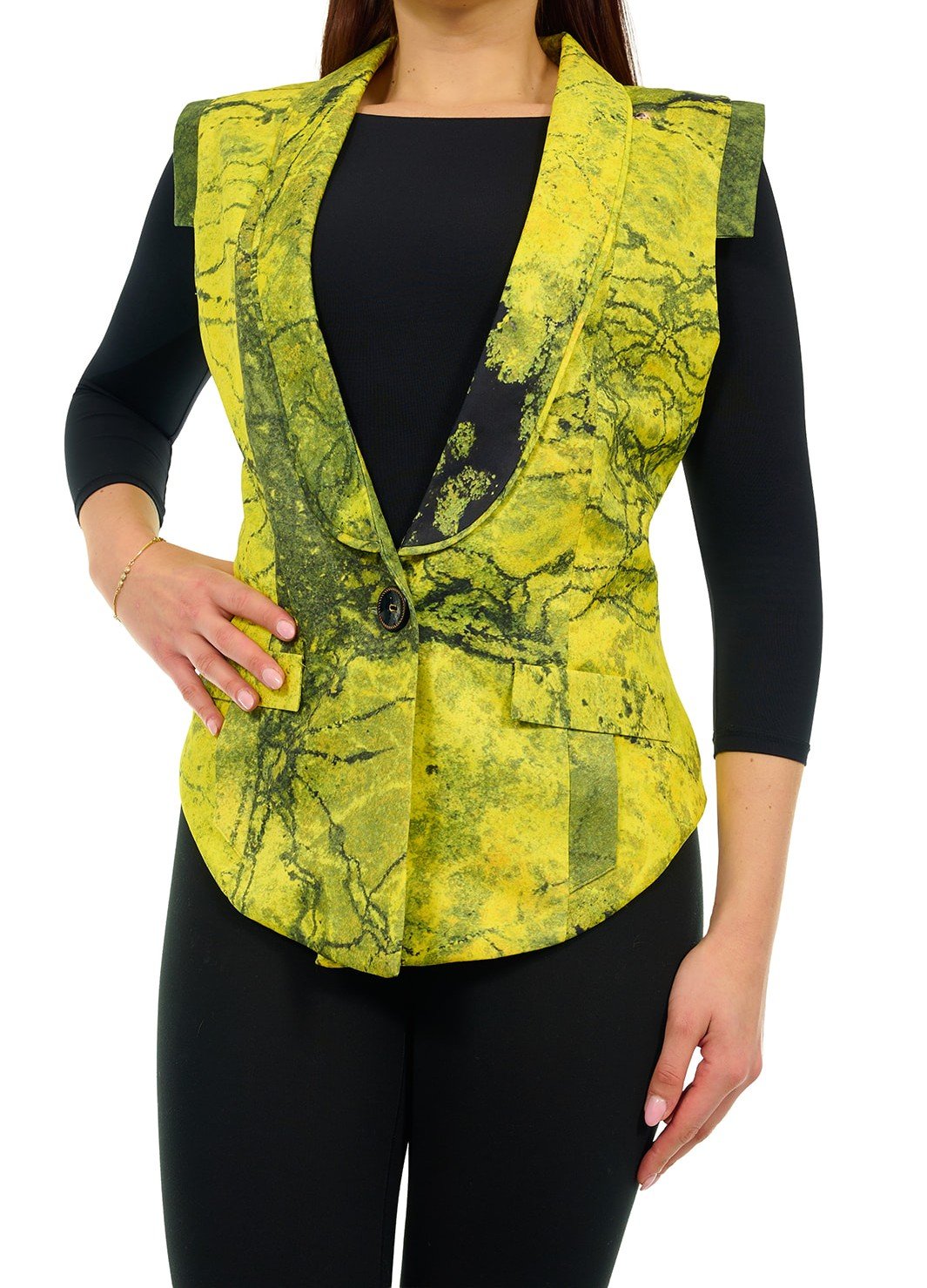 Discover a unique harmony of style and comfort. This elegant women’s vest in an algae inspired shade, a beautiful yellow green tone drawn from nature, stands out with its refined, feminine cut. The length makes it a perfect choice for a business meeting, dinner, or a walk around the city.Made from a soft, pleasant to the touch fabric, it provides all day comfort.