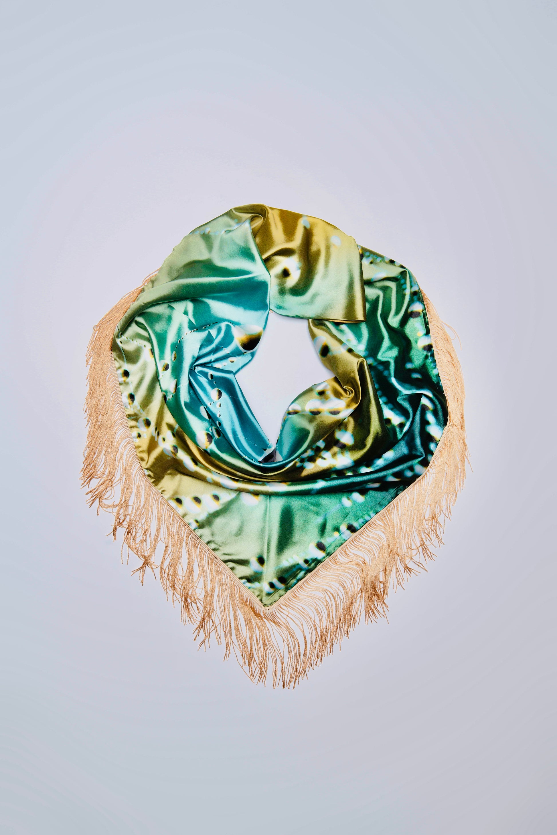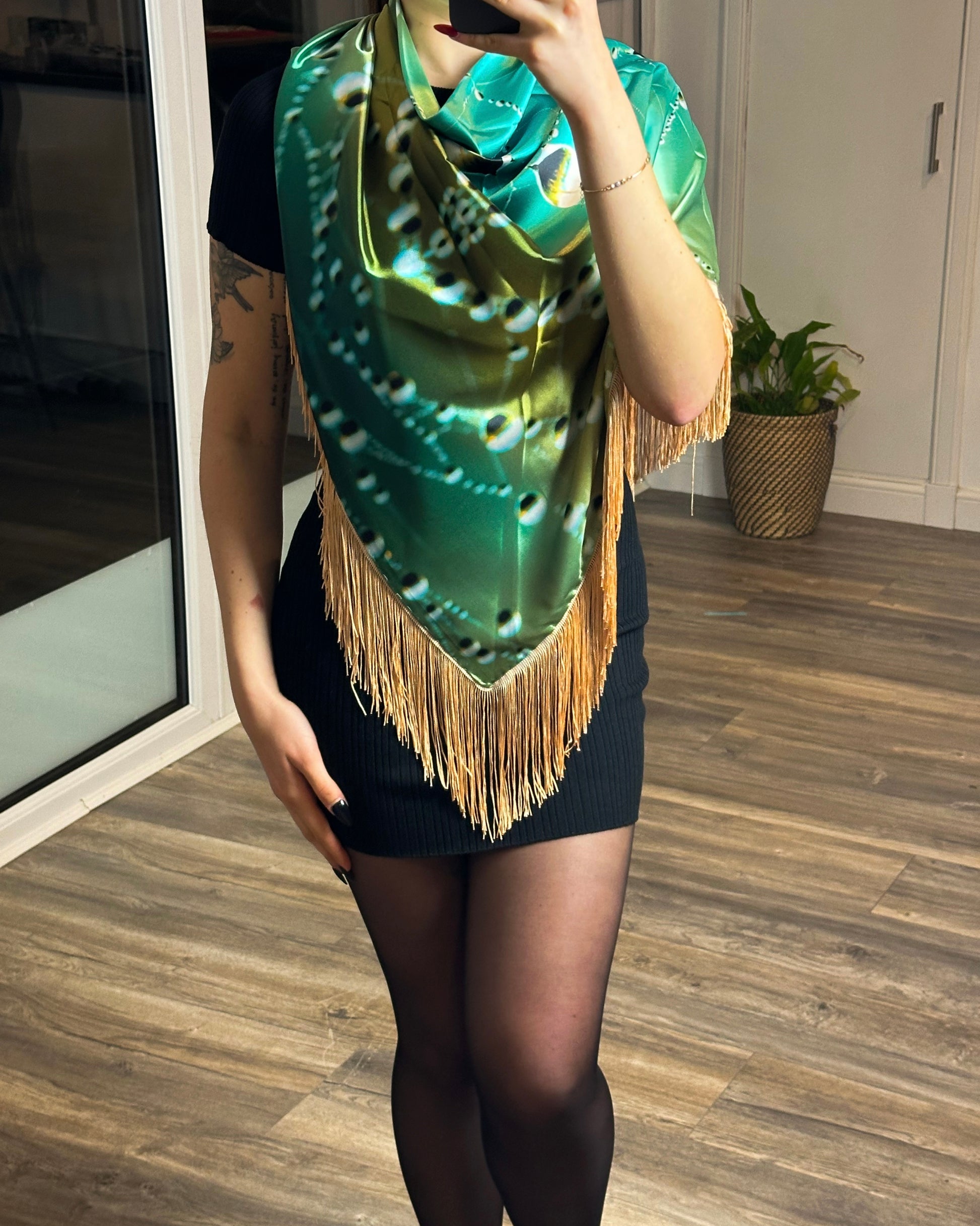 This luxurious piece features a rich blend of deep greens, indigos, and hints of violet, reminiscent of a twilight forest or the magic of the northern lights. The silky satin fabric captures light beautifully, while the soft fringe adds an elegant, bohemian flair.