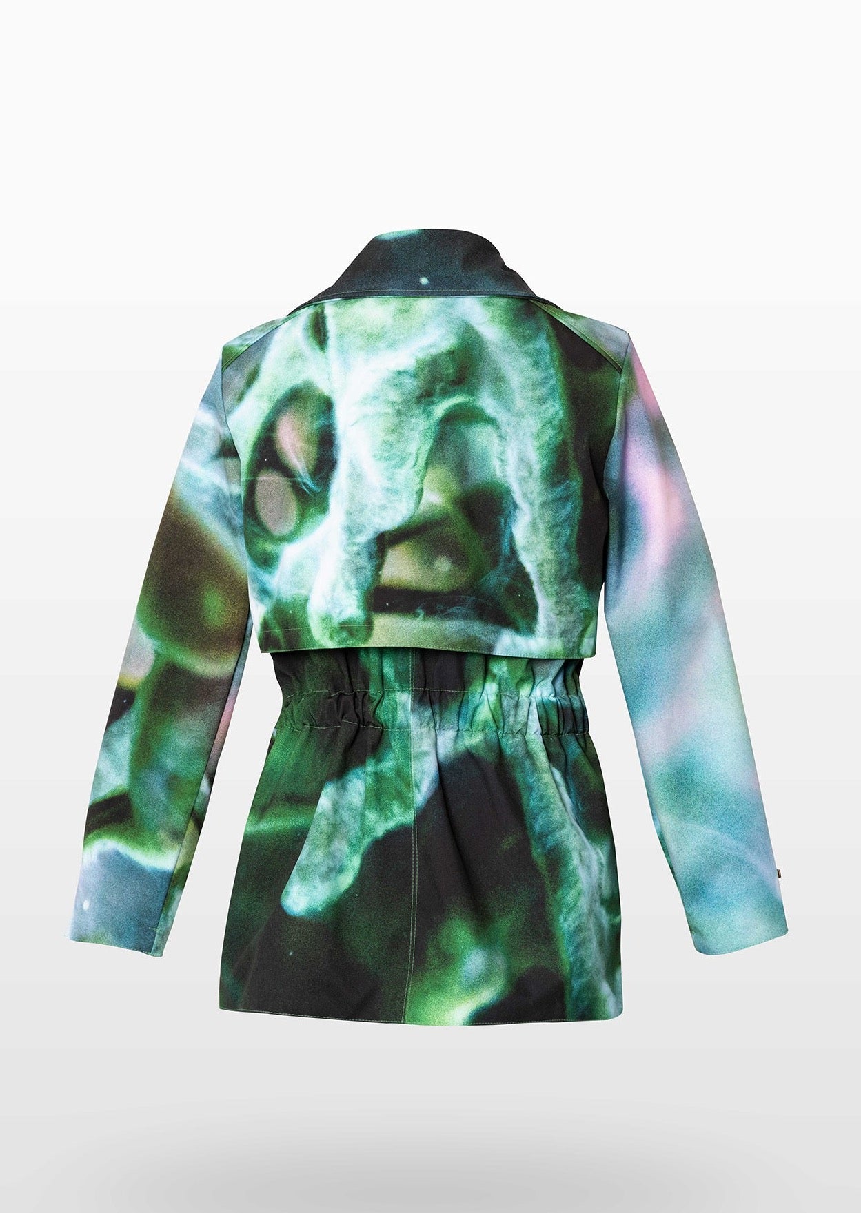 The glowing green print is mesmerizing! It’s lightweight but durable, and the belt accentuates my waist so well. I love wearing it in unpredictable weather.